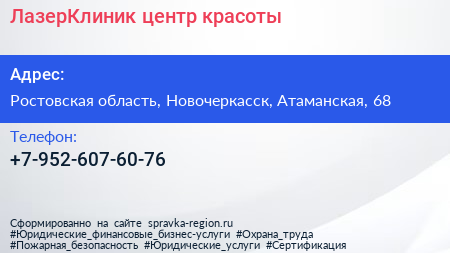 ЛазерКлиник, центр красоты по адресу Ростовская область, Новочеркасск, Атаманская, 68 в дальнейшем Организация, размещена в следующих категориях:
