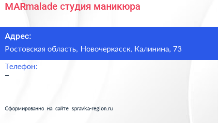 MARmalade, студия маникюра по адресу Ростовская область, Новочеркасск, Калинина, 73 в дальнейшем Организация, размещена в следующих категориях: