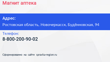 Магнит, аптека по адресу Ростовская область, Новочеркасск, Будённовская, 94 в дальнейшем Организация, размещена в следующих категориях: