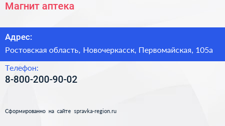 Магнит, аптека по адресу Ростовская область, Новочеркасск, Первомайская, 105а в дальнейшем Организация, размещена в следующих категориях:
