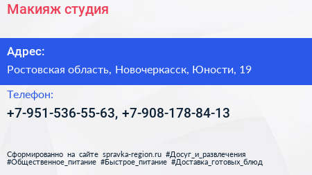 Макияж, студия по адресу Ростовская область, Новочеркасск, Юности, 19 в дальнейшем Организация, размещена в следующих категориях: