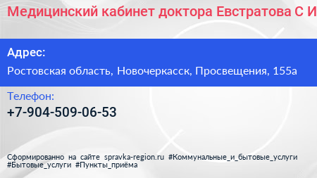 Медицинский кабинет доктора Евстратова С.И. по адресу Ростовская область, Новочеркасск, Просвещения, 155а в дальнейшем Организация, размещена в следующих категориях: