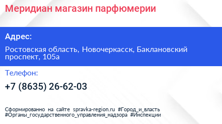 Меридиан, магазин парфюмерии по адресу Ростовская область, Новочеркасск, Баклановский проспект, 105а в дальнейшем Организация, размещена в следующих категориях: