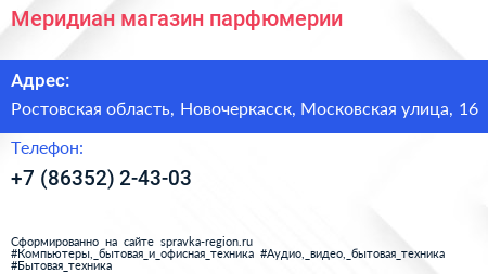 Меридиан, магазин парфюмерии по адресу Ростовская область, Новочеркасск, Московская улица, 16 в дальнейшем Организация, размещена в следующих категориях: