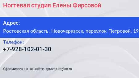 Ногтевая студия Елены Фирсовой по адресу Ростовская область, Новочеркасск, переулок Петровой, 19 в дальнейшем Организация, размещена в следующих категориях: