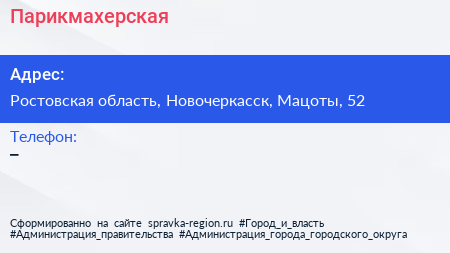 Парикмахерская по адресу Ростовская область, Новочеркасск, Мацоты, 52 в дальнейшем Организация, размещена в следующих категориях: