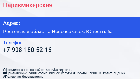 Парикмахерская по адресу Ростовская область, Новочеркасск, Юности, 6а в дальнейшем Организация, размещена в следующих категориях: