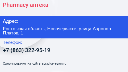 Pharmacy, аптека по адресу Ростовская область, Новочеркасск, улица Аэропорт Платов, 1 в дальнейшем Организация, размещена в следующих категориях: