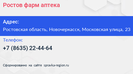 Ростов фарм, аптека по адресу Ростовская область, Новочеркасск, Московская улица, 23 в дальнейшем Организация, размещена в следующих категориях: