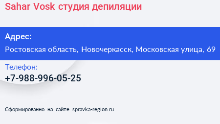 Sahar & Vosk, студия депиляции по адресу Ростовская область, Новочеркасск, Московская улица, 69 в дальнейшем Организация, размещена в следующих категориях: