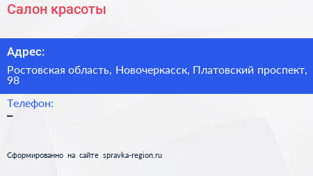 Салон красоты по адресу Ростовская область, Новочеркасск, Платовский проспект, 98 в дальнейшем Организация, размещена в следующих категориях: