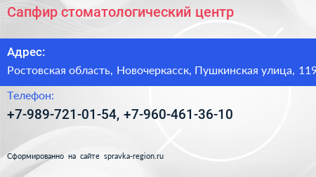Сапфир, стоматологический центр по адресу Ростовская область, Новочеркасск, Пушкинская улица, 119 в дальнейшем Организация, размещена в следующих категориях: