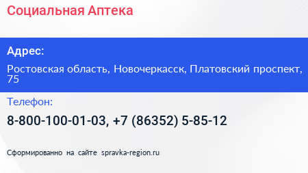 Социальная Аптека по адресу Ростовская область, Новочеркасск, Платовский проспект, 75 в дальнейшем Организация, размещена в следующих категориях: