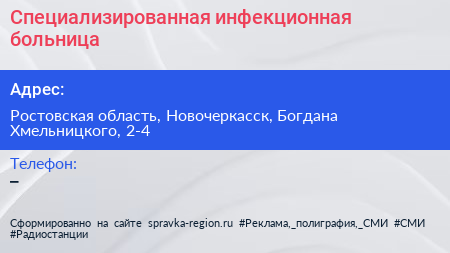 Специализированная инфекционная больница по адресу Ростовская область, Новочеркасск, Богдана Хмельницкого, 2-4 в дальнейшем Организация, размещена в следующих категориях: