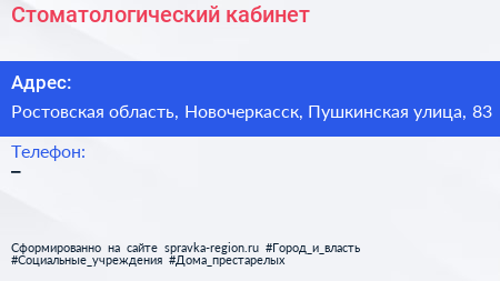 Стоматологический кабинет по адресу Ростовская область, Новочеркасск, Пушкинская улица, 83 в дальнейшем Организация, размещена в следующих категориях:
