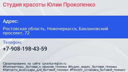 Студия красоты Юлии Прокопенко по адресу Ростовская область, Новочеркасск, Баклановский проспект, 72 в дальнейшем Организация, размещена в следующих категориях: