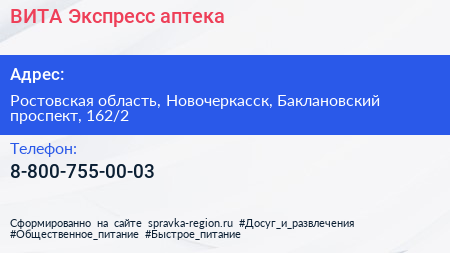 ВИТА Экспресс, аптека по адресу Ростовская область, Новочеркасск, Баклановский проспект, 162/2 в дальнейшем Организация, размещена в следующих категориях: