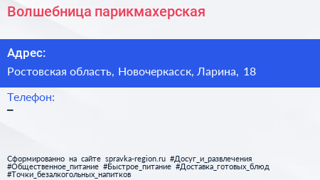Волшебница, парикмахерская по адресу Ростовская область, Новочеркасск, Ларина, 18 в дальнейшем Организация, размещена в следующих категориях: