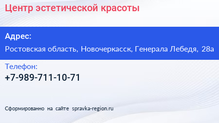 Центр эстетической красоты по адресу Ростовская область, Новочеркасск, Генерала Лебедя, 28а в дальнейшем Организация, размещена в следующих категориях: