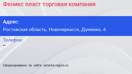 Феникс пласт, торговая компания по адресу Ростовская область, Новочеркасск, Думенко, 6 в дальнейшем Организация, размещена в следующих категориях:
