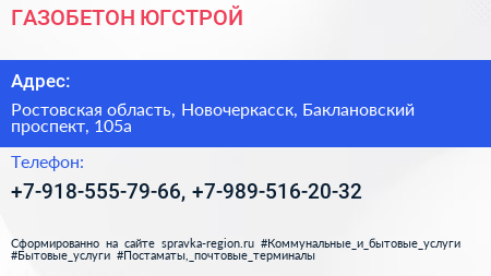ГАЗОБЕТОН-ЮГСТРОЙ по адресу Ростовская область, Новочеркасск, Баклановский проспект, 105а в дальнейшем Организация, размещена в следующих категориях: