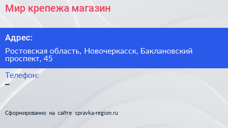 Мир крепежа, магазин по адресу Ростовская область, Новочеркасск, Баклановский проспект, 45 в дальнейшем Организация, размещена в следующих категориях: