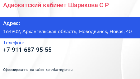 Адвокатский кабинет Шарикова С.Р. по адресу 164902, Архангельская область, Новодвинск, Новая, 40 в дальнейшем Организация, размещена в следующих категориях: