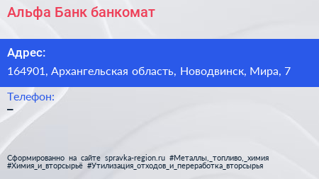 Альфа-Банк, банкомат по адресу 164901, Архангельская область, Новодвинск, Мира, 7 в дальнейшем Организация, размещена в следующих категориях: