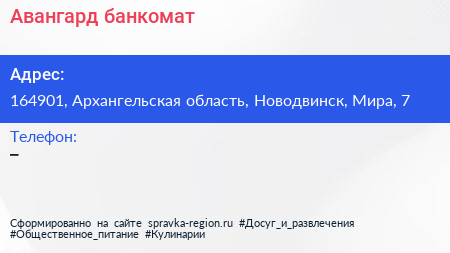 Авангард, банкомат по адресу 164901, Архангельская область, Новодвинск, Мира, 7 в дальнейшем Организация, размещена в следующих категориях: