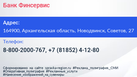 Банк Финсервис по адресу 164900, Архангельская область, Новодвинск, Советов, 27 в дальнейшем Организация, размещена в следующих категориях: