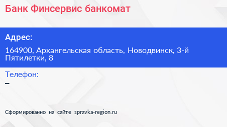 Банк Финсервис, банкомат по адресу 164900, Архангельская область, Новодвинск, 3-й Пятилетки, 8 в дальнейшем Организация, размещена в следующих категориях: