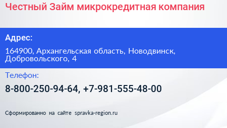 Честный Займ, микрокредитная компания по адресу 164900, Архангельская область, Новодвинск, Добровольского, 4 в дальнейшем Организация, размещена в следующих категориях: