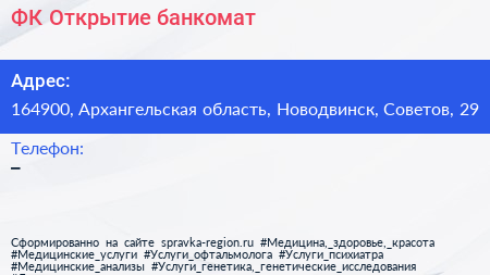 ФК Открытие, банкомат по адресу 164900, Архангельская область, Новодвинск, Советов, 29 в дальнейшем Организация, размещена в следующих категориях: