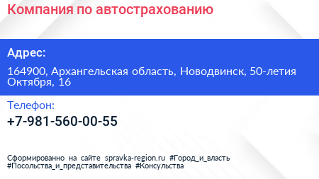 Компания по автострахованию по адресу 164900, Архангельская область, Новодвинск, 50-летия Октября, 16 в дальнейшем Организация, размещена в следующих категориях: