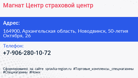 Магнат Центр, страховой центр по адресу 164900, Архангельская область, Новодвинск, 50-летия Октября, 26 в дальнейшем Организация, размещена в следующих категориях: