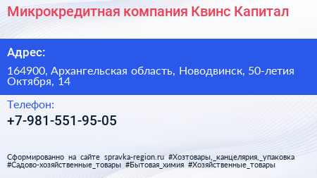 Микрокредитная компания Квинс-Капитал по адресу 164900, Архангельская область, Новодвинск, 50-летия Октября, 14 в дальнейшем Организация, размещена в следующих категориях: