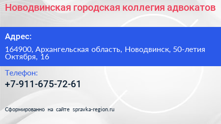 Новодвинская городская коллегия адвокатов по адресу 164900, Архангельская область, Новодвинск, 50-летия Октября, 16 в дальнейшем Организация, размещена в следующих категориях: