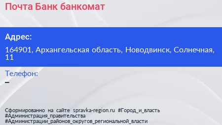 Почта Банк, банкомат по адресу 164901, Архангельская область, Новодвинск, Солнечная, 11 в дальнейшем Организация, размещена в следующих категориях: