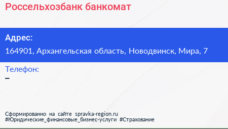 Россельхозбанк, банкомат по адресу 164901, Архангельская область, Новодвинск, Мира, 7 в дальнейшем Организация, размещена в следующих категориях: