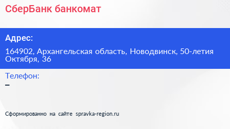 СберБанк, банкомат по адресу 164902, Архангельская область, Новодвинск, 50-летия Октября, 36 в дальнейшем Организация, размещена в следующих категориях: