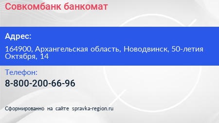 Совкомбанк, банкомат по адресу 164900, Архангельская область, Новодвинск, 50-летия Октября, 14 в дальнейшем Организация, размещена в следующих категориях: