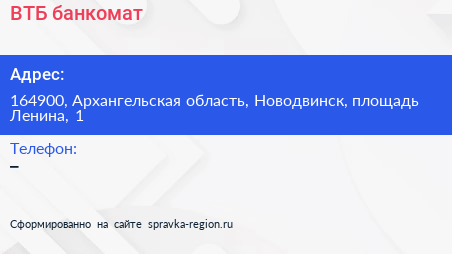 ВТБ, банкомат по адресу 164900, Архангельская область, Новодвинск, площадь Ленина, 1 в дальнейшем Организация, размещена в следующих категориях: