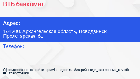 ВТБ, банкомат по адресу 164900, Архангельская область, Новодвинск, Пролетарская, 61 в дальнейшем Организация, размещена в следующих категориях: