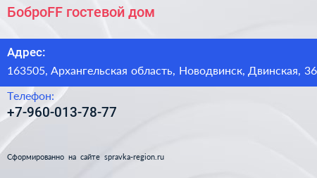 БоброFF, гостевой дом по адресу 163505, Архангельская область, Новодвинск, Двинская, 36 в дальнейшем Организация, размещена в следующих категориях: