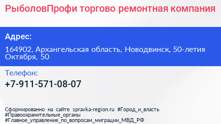 РыболовПрофи, торгово-ремонтная компания по адресу 164902, Архангельская область, Новодвинск, 50-летия Октября, 50 в дальнейшем Организация, размещена в следующих категориях: