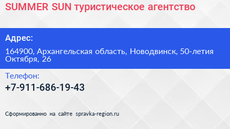 SUMMER SUN, туристическое агентство по адресу 164900, Архангельская область, Новодвинск, 50-летия Октября, 26 в дальнейшем Организация, размещена в следующих категориях: