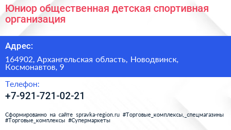 Юниор, общественная детская спортивная организация по адресу 164902, Архангельская область, Новодвинск, Космонавтов, 9 в дальнейшем Организация, размещена в следующих категориях: