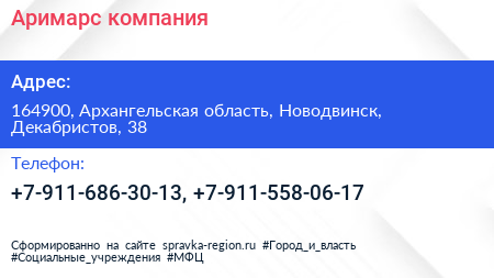 Аримарс, компания по адресу 164900, Архангельская область, Новодвинск, Декабристов, 38 в дальнейшем Организация, размещена в следующих категориях: