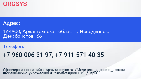 ORGSYS по адресу 164900, Архангельская область, Новодвинск, Декабристов, 66 в дальнейшем Организация, размещена в следующих категориях: