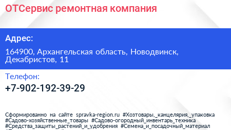 ОТСервис, ремонтная компания по адресу 164900, Архангельская область, Новодвинск, Декабристов, 11 в дальнейшем Организация, размещена в следующих категориях: